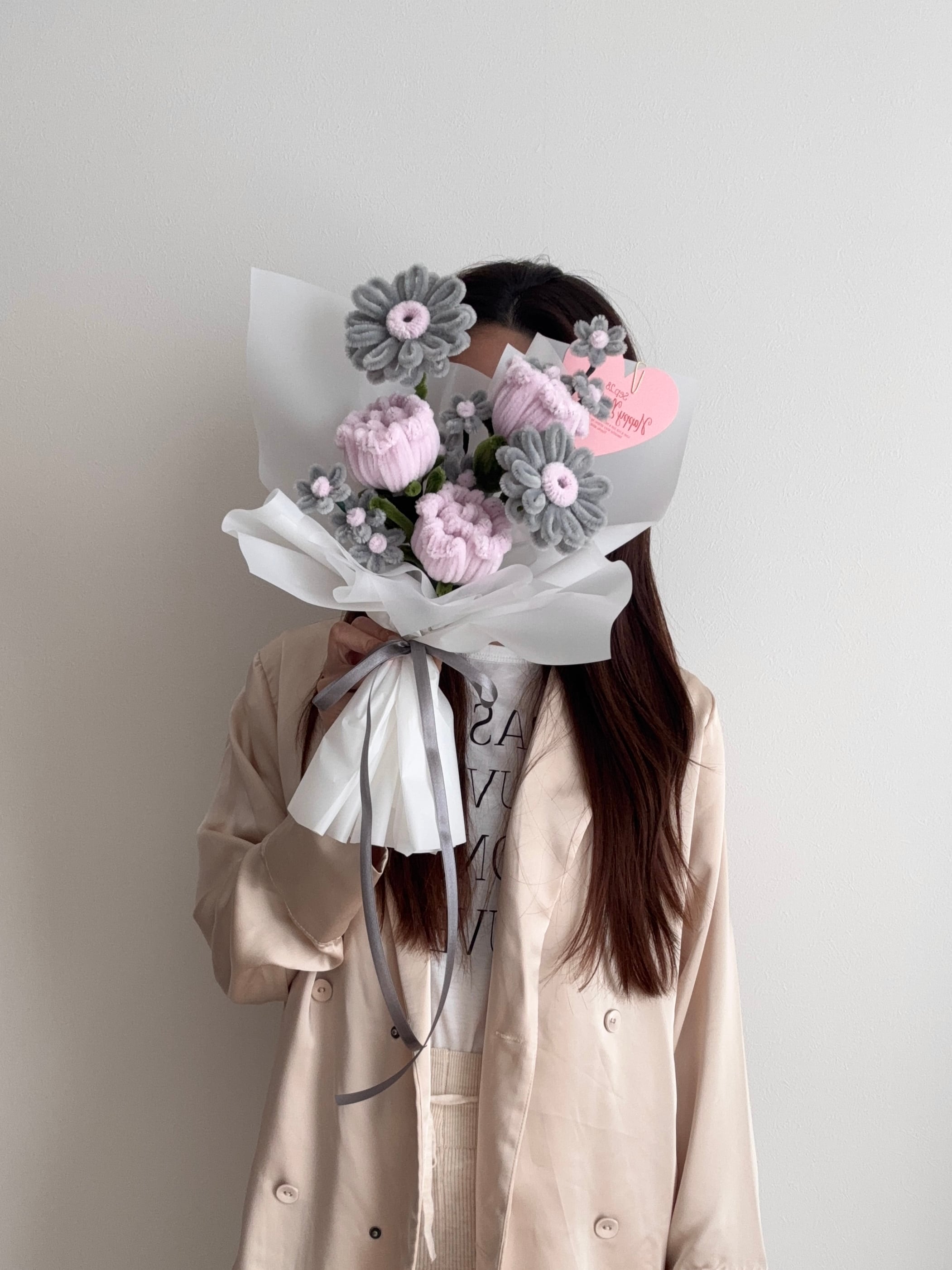 pink×gray G bouquet – 8 Stems (Fully Wrapped)