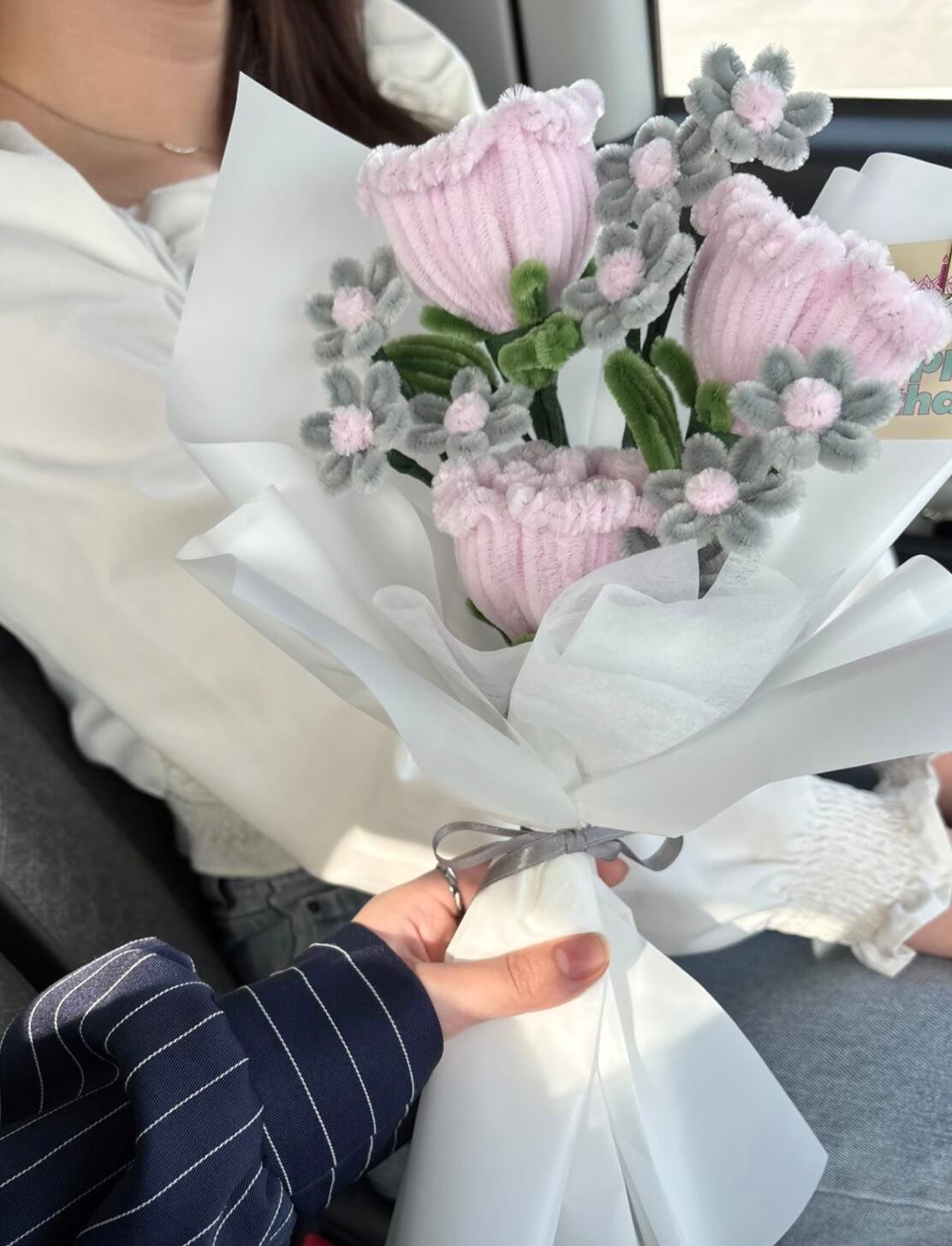 It is made with 6 pipe cleaner flowers, arranged as a bouquet and delivered fully wrapped.