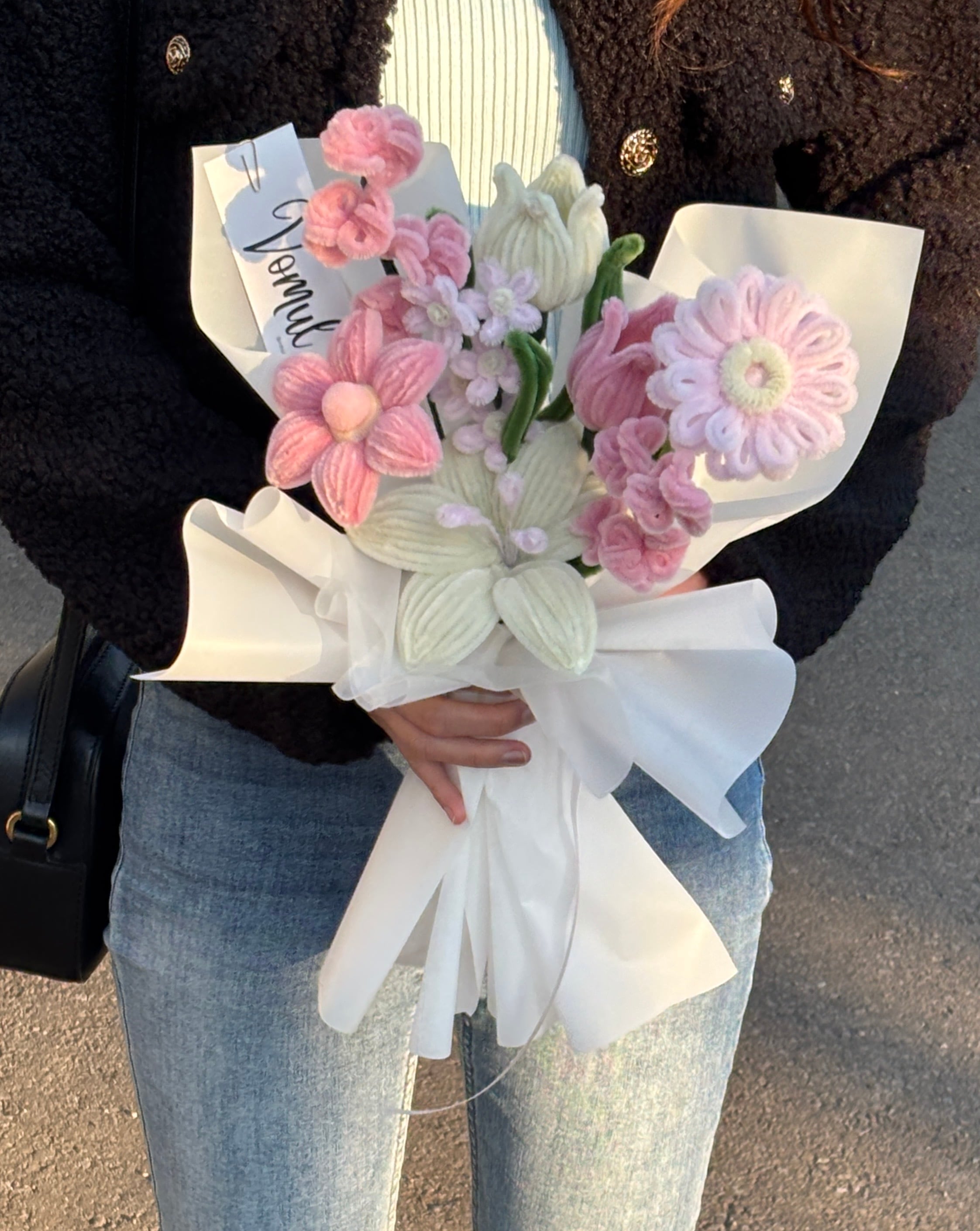 It is made with 8 pipe cleaner flowers, arranged as a bouquet and delivered fully wrapped.
