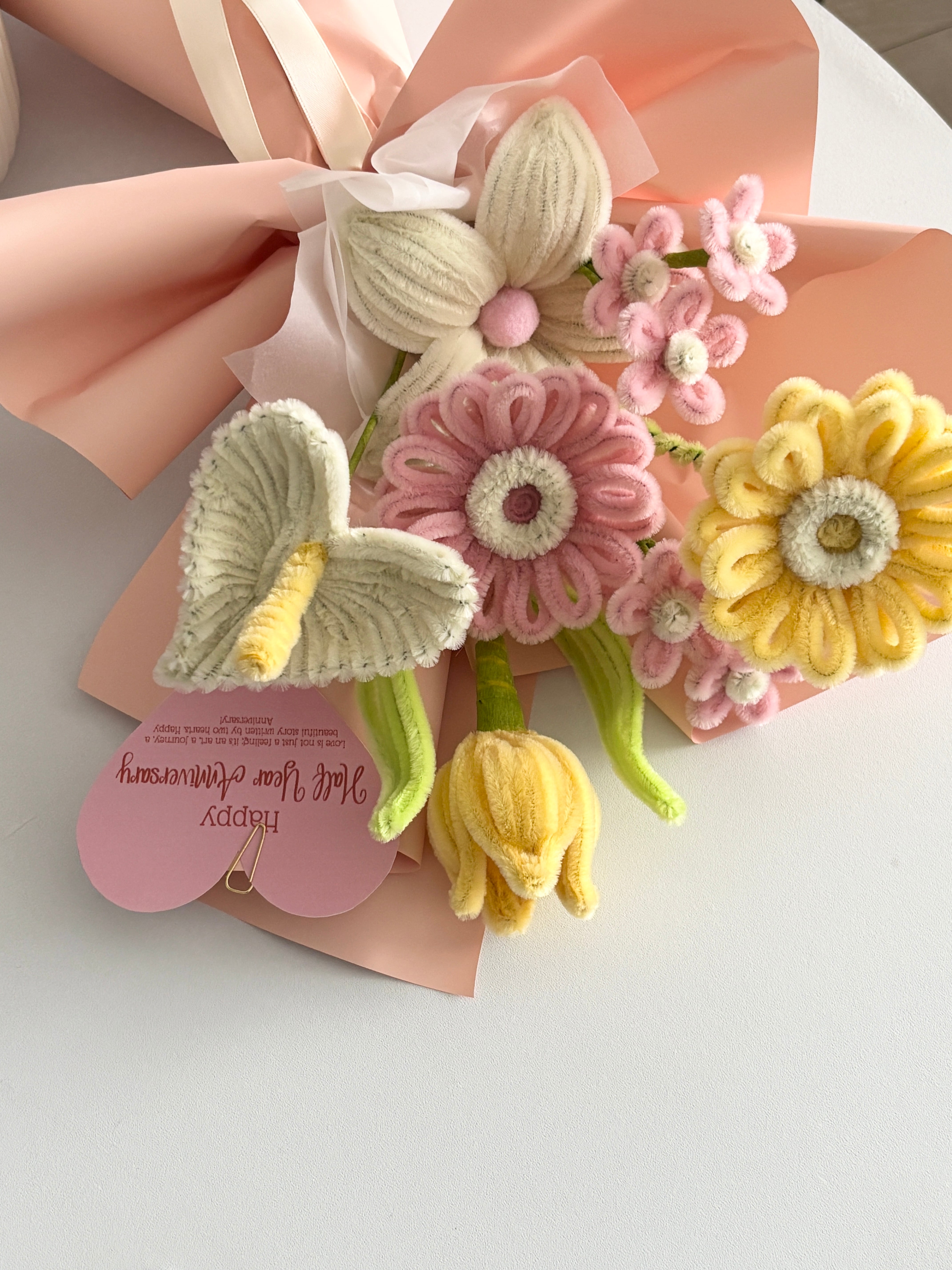 It is made with 7 pipe cleaner flowers, arranged as a bouquet and delivered fully wrapped.
