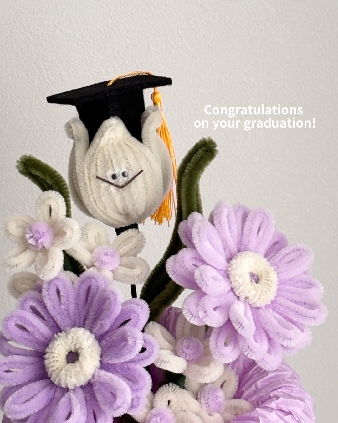 スマイルチューリップ入りの花束から+300円で卒業帽の追加が可能です。