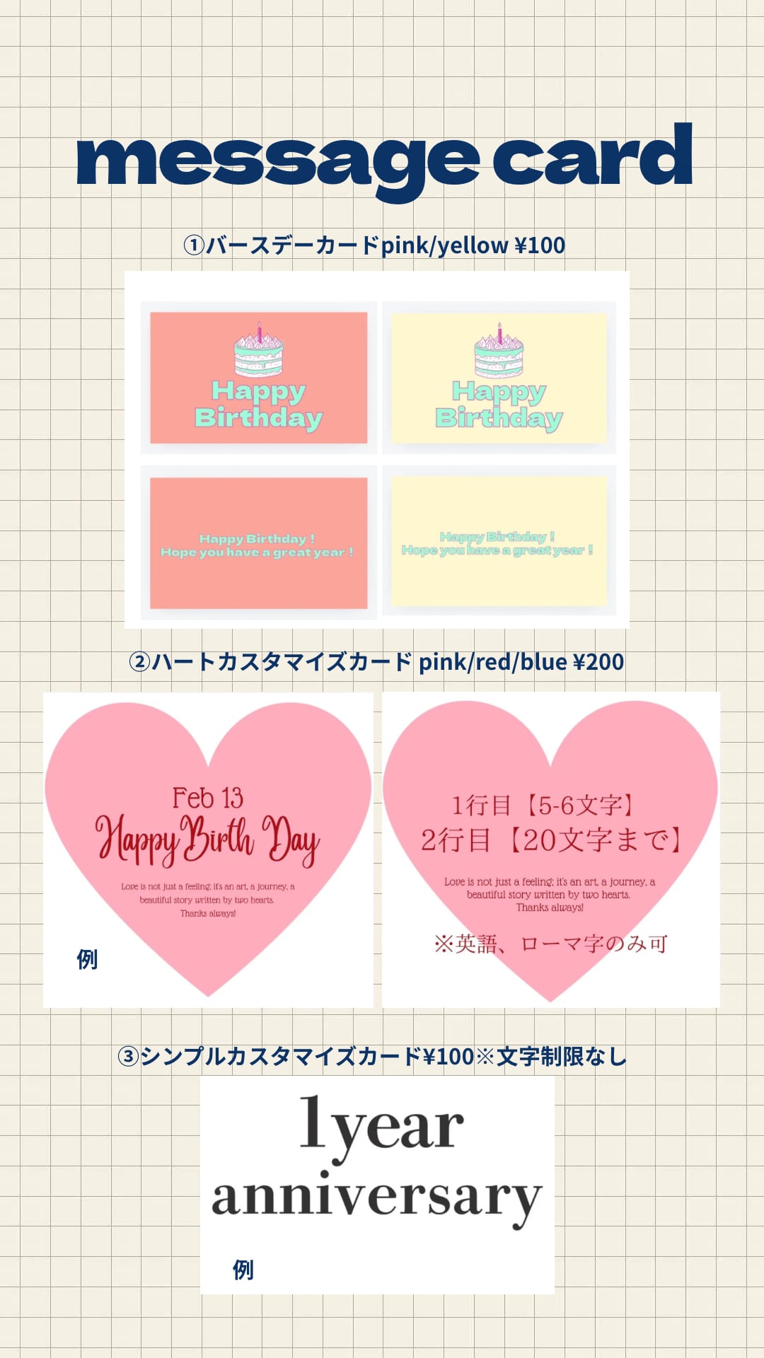 また、カスタマイズカード選択の場合は備考欄にご希望のメッセージ内容をご記載くださいませ。