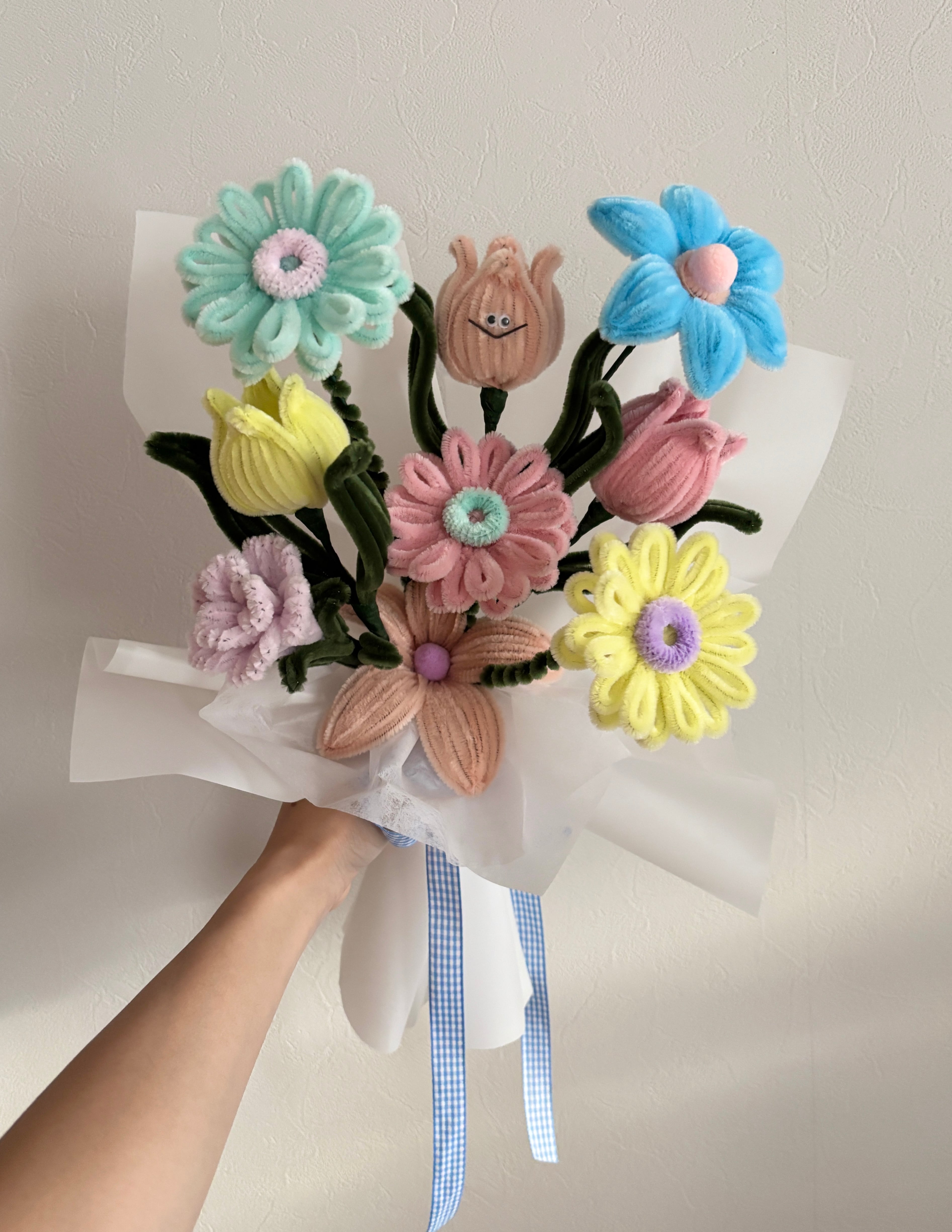 顔つきチューリップ含め、モールフラワー9本を花束にしたタイプとなります。(ラッピング込み)
